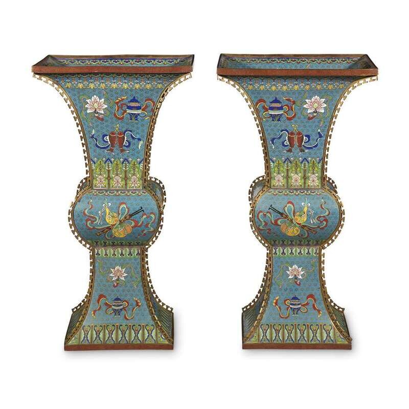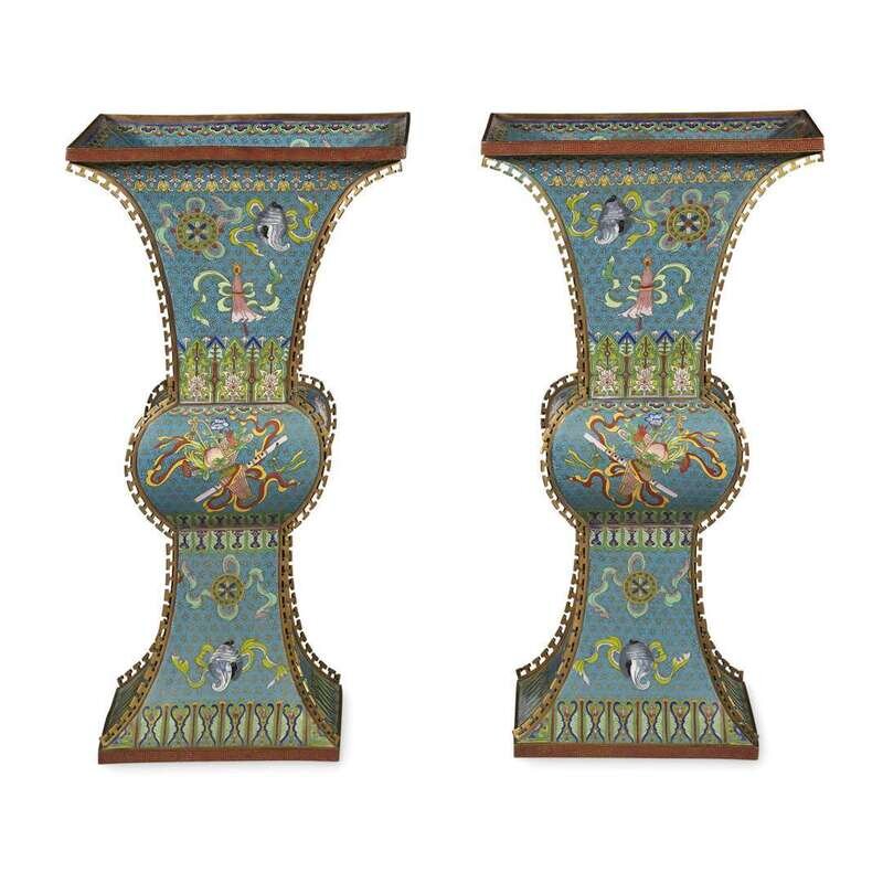 Of archaistic gu form with four notched flanges and a square mid-section, the exterior and the interior of the flaring mouth of each vase is decorated with the Eight Emblems between bands of lappets and stylized lotus on a turquoise ground.