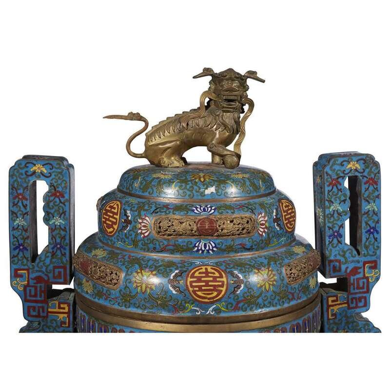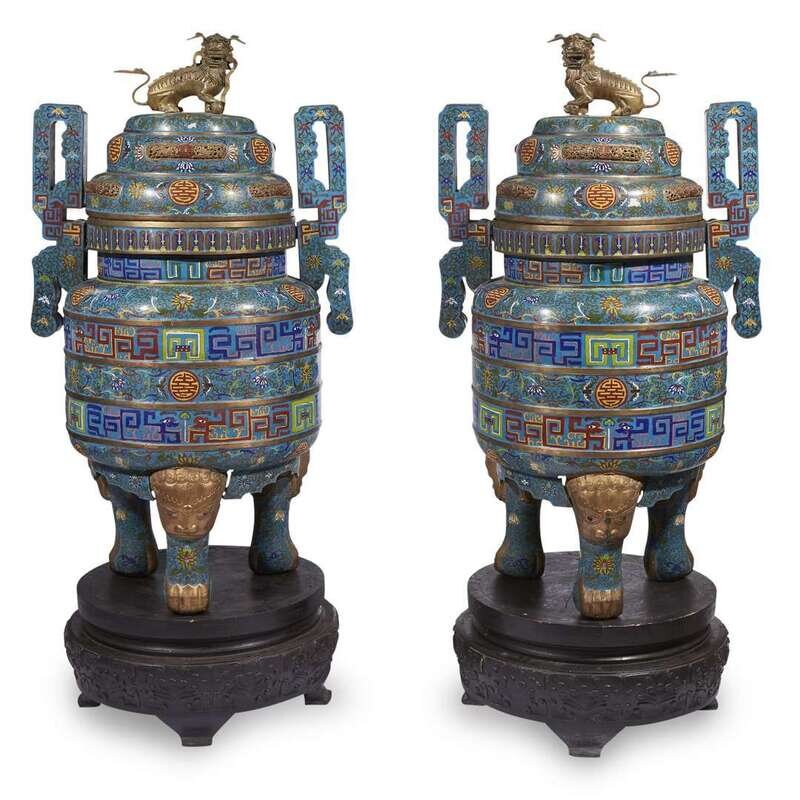 Each with twin-handled cylindrical body raised on three legs, with domed cover, lion finial, carved wood stand, the cloisonne decorated with lotus and archaistic scrollwork, bats and shou symbols, against a turqouise ground.