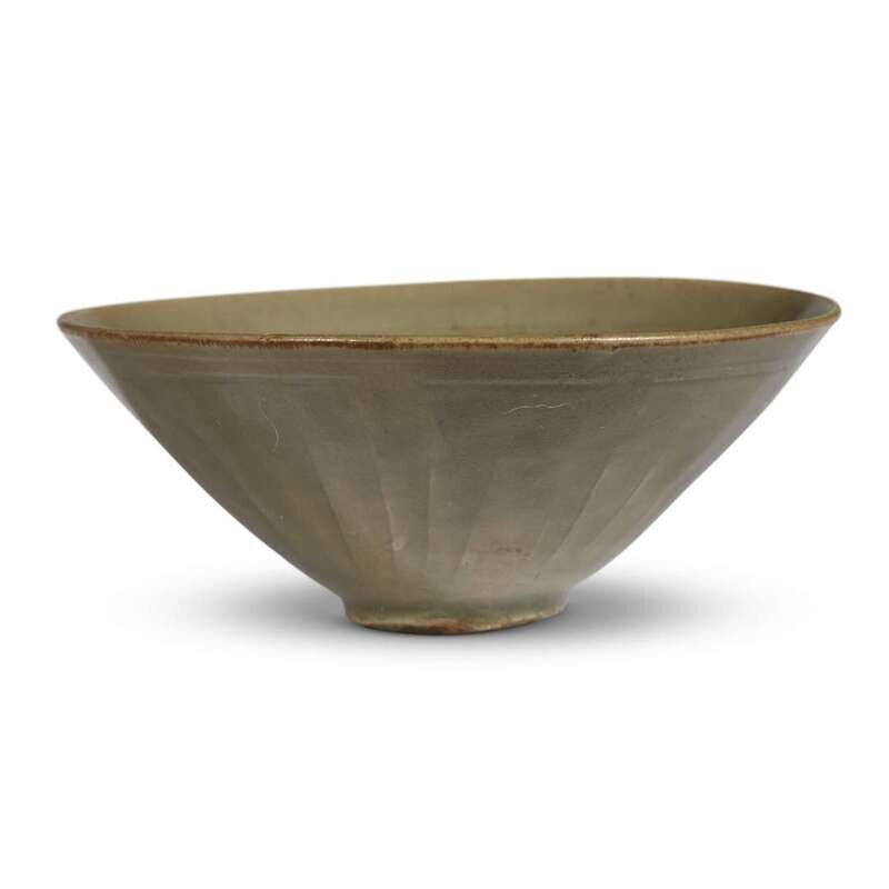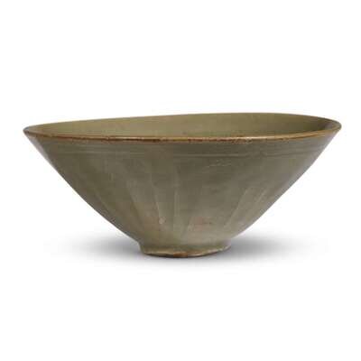 Moulded on the interior with fish swimming admist rippling waves and carved to the exterior with vertical lines radiating from the base, covered overall with a green glaze.