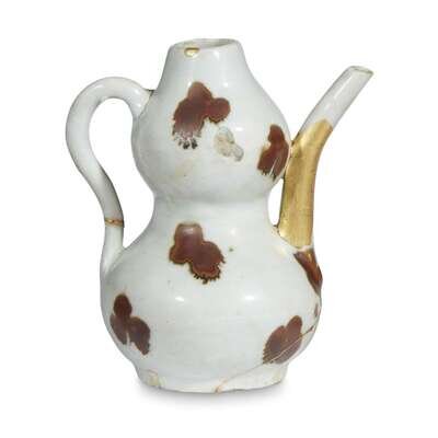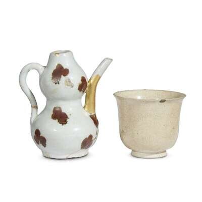 A small Chinese "tobi seiji" double gourd ewer and a white ware cup the first song/yuan dynasty, the cup probably tang dynasty