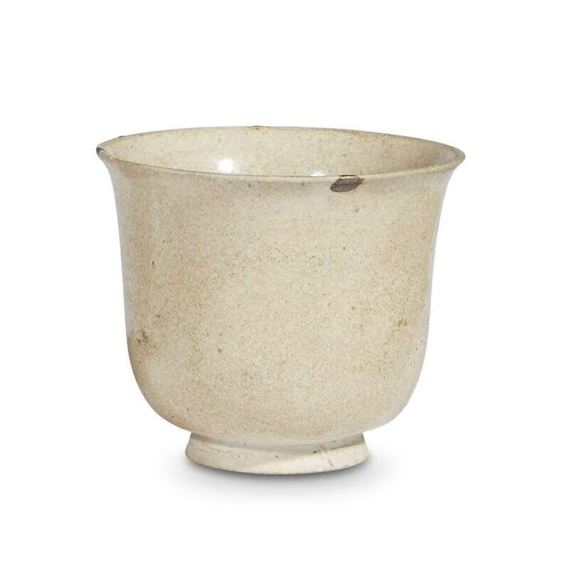 The ewer with kintsugi repair, the blueish-white glaze accented with splashes of iron brown; the warm white-glazed pottery cup with flared rim, supported on a short spreading foot ring.