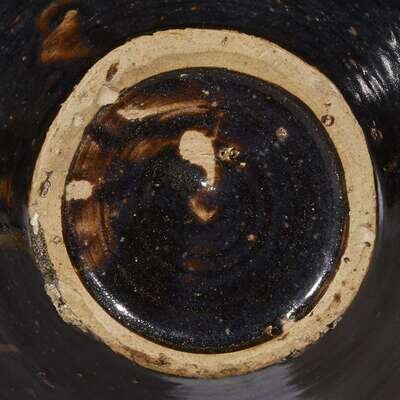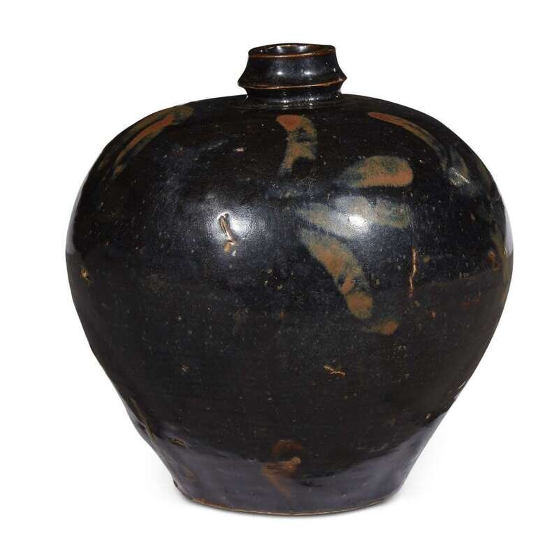 Of globular form, with a short waisted neck decorated with russett stylized floral design on a dark brown ground.
