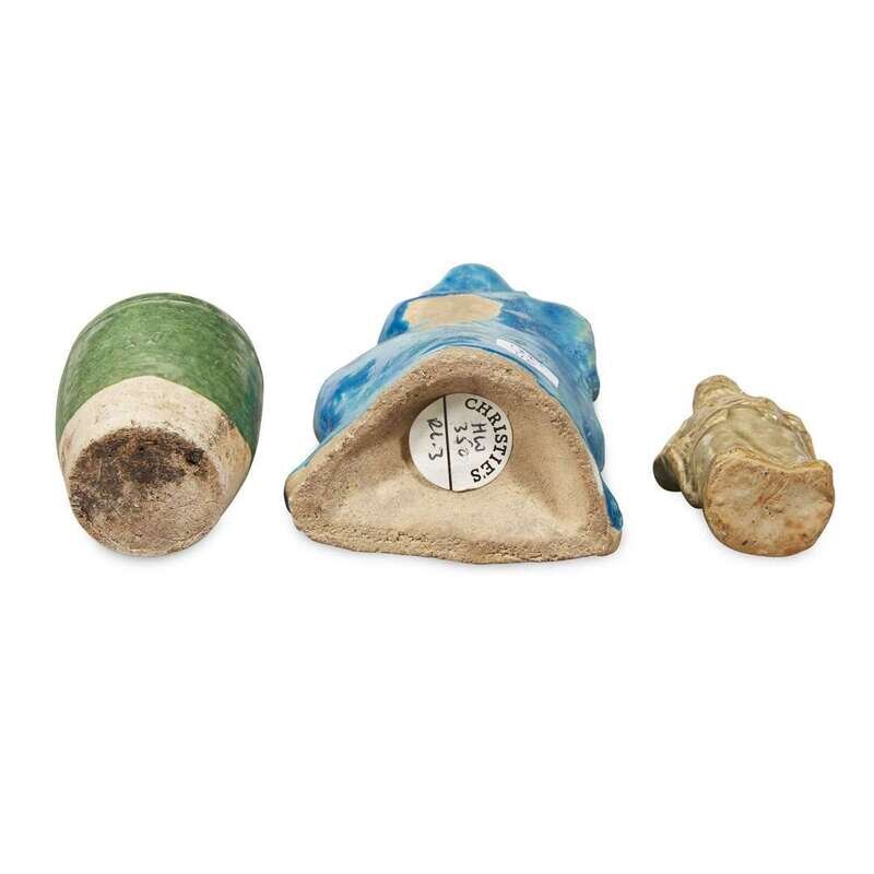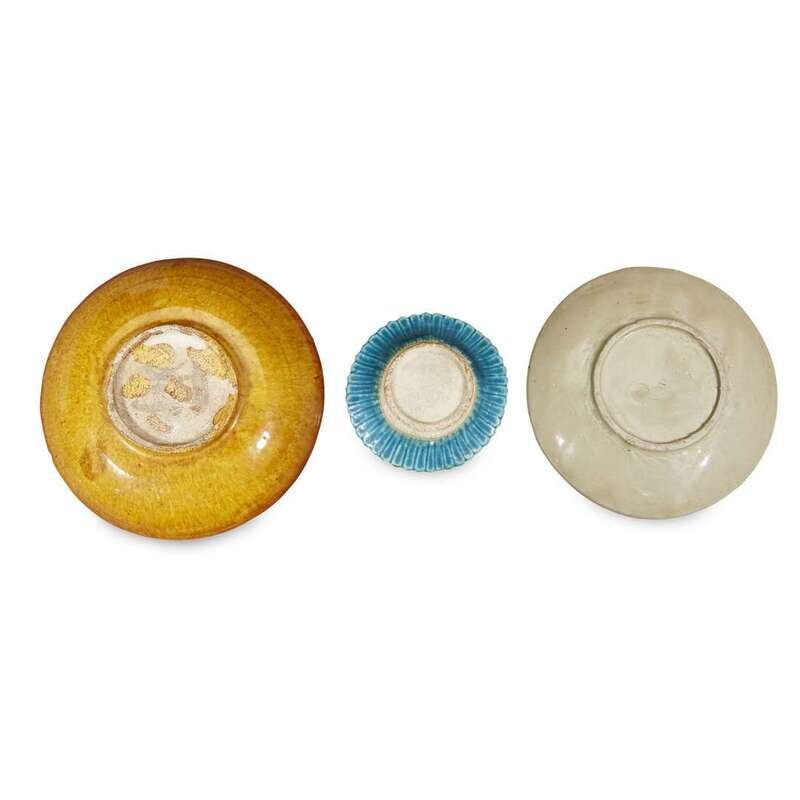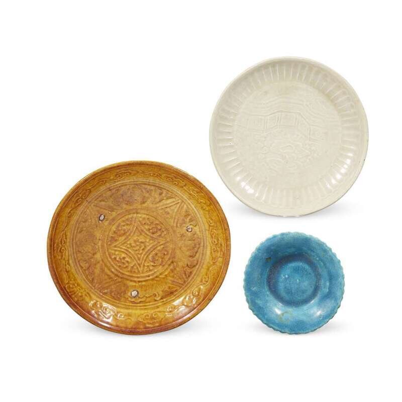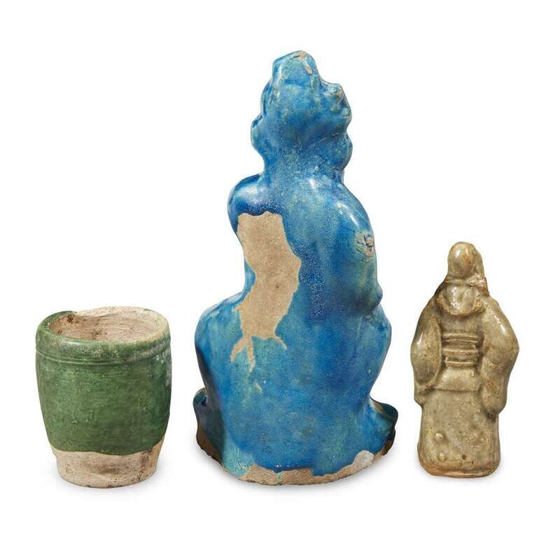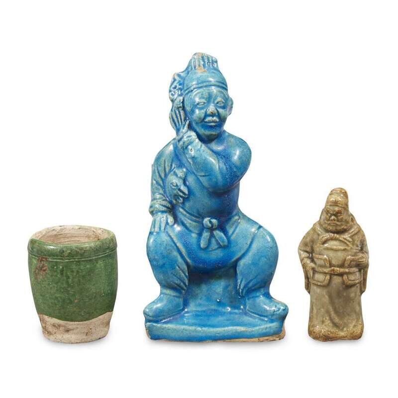Comprising: a Yaozhou-type celadon-glazed figure of Guandi or a warrior guardian; a turquoise-glazed figure of a seated man with cockerel under his arm; a green-glazed pottery small cup; a turquoise-glazed small dish, molded with petals to the exterior; a Dingyao-type shallow dish molded with a scholar's rock in a garden, petal border; an amber-glazed pottery shallow dish with molded geometric patterns, bordered by scrolling clouds.