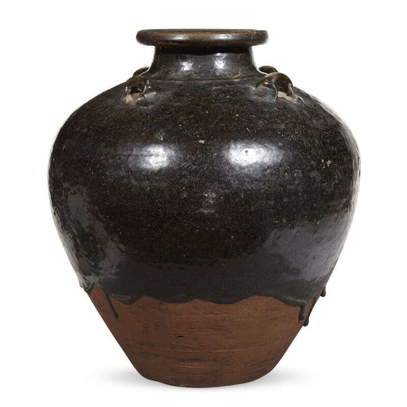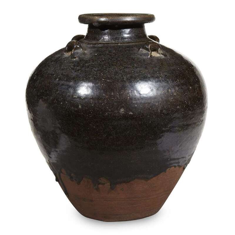 With a bulbous, tapered body and four lug handles at the shoulder, short neck with wide, rounded lip, covered with a thick brown-black glaze ending in an irregular line above foot showing the body, burned red-brown.
