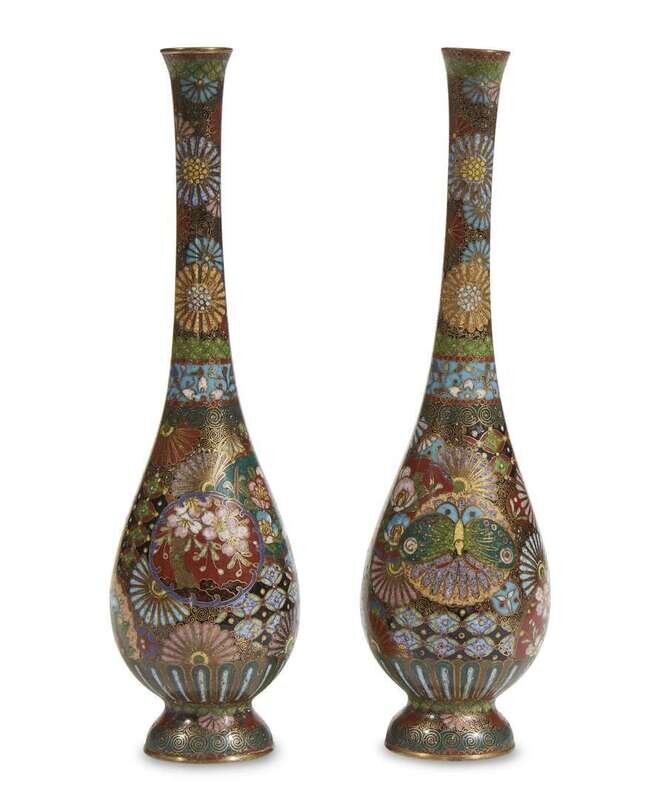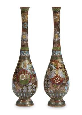 A pair of small finely-decorated Japanese cloisonne pear-shaped vases circa 1880