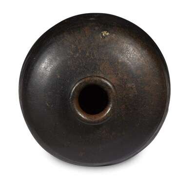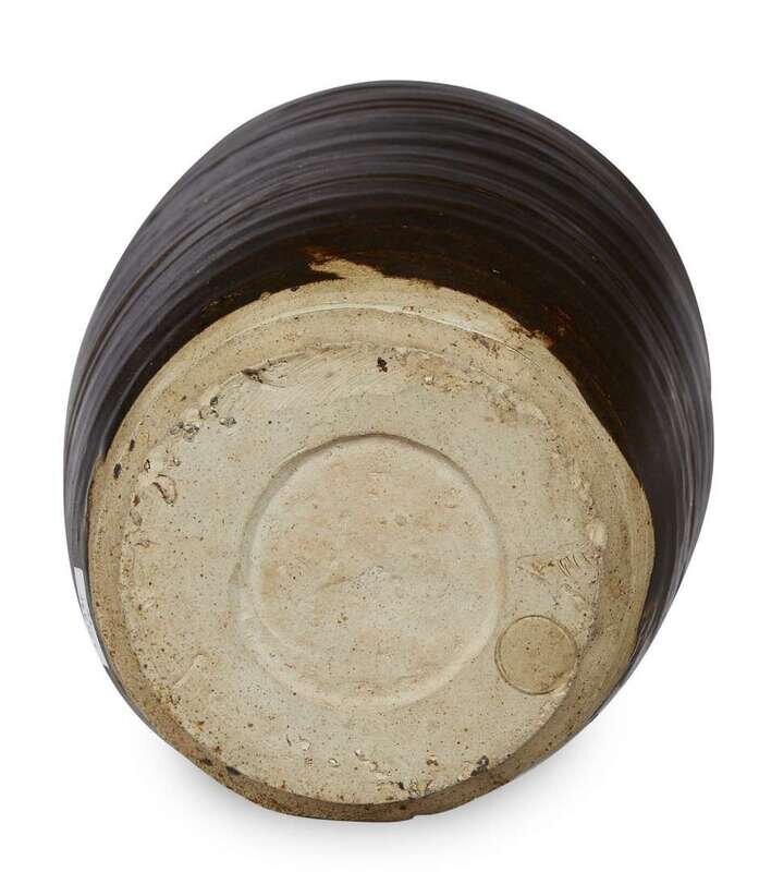 Of cylindrical form with a flaring mouth and a tapered foot, the jar covered by a matte glaze of black falling in an irregular line above foot exposing the buffware and decorated with circumferential marks.