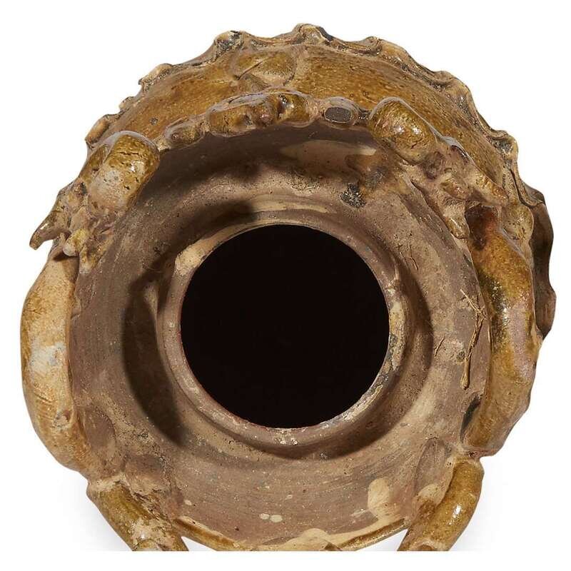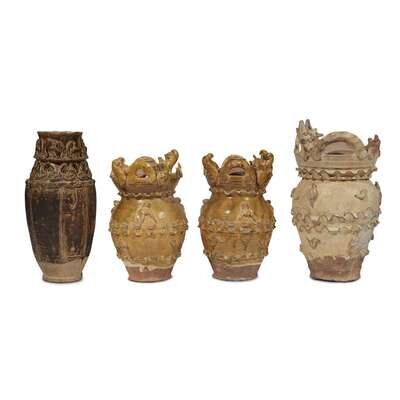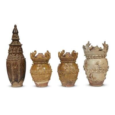 Four Southern Chinese modeled brown-glazed pottery and stoneware jars and covers possibly 8th-12th century