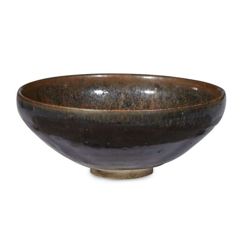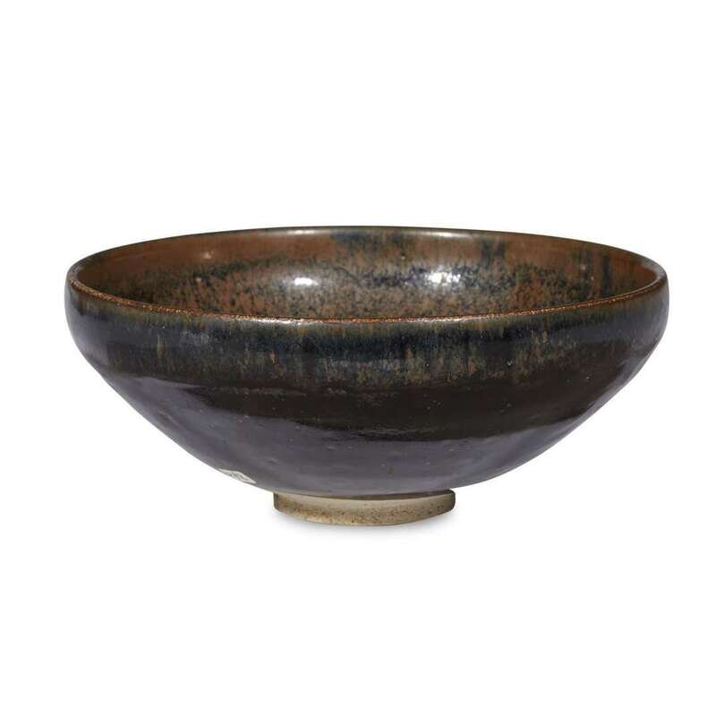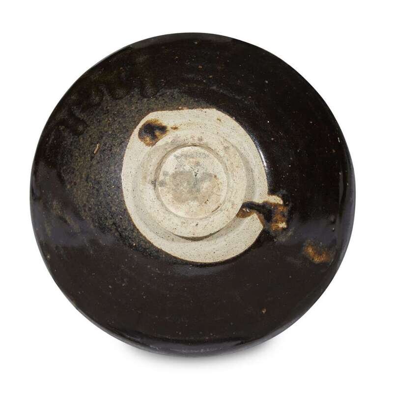 Covered on the interior with a lustrous blackish glaze streaked in russet thinning below rim and ending above foot to expose buffware.