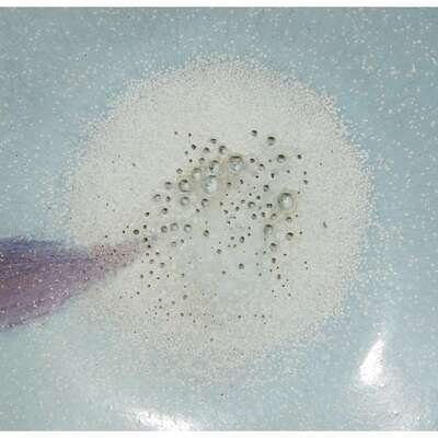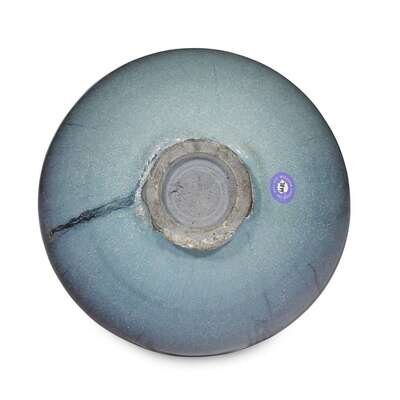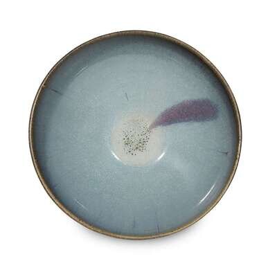 Covered inside and out with a glaze of pale blue thinning to the mushroom on rim and falling in an irregular line around foot, interior with a purple splash.