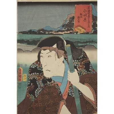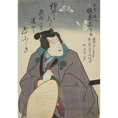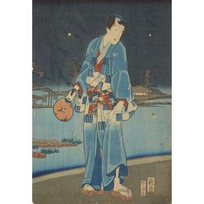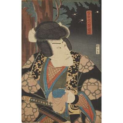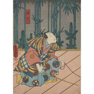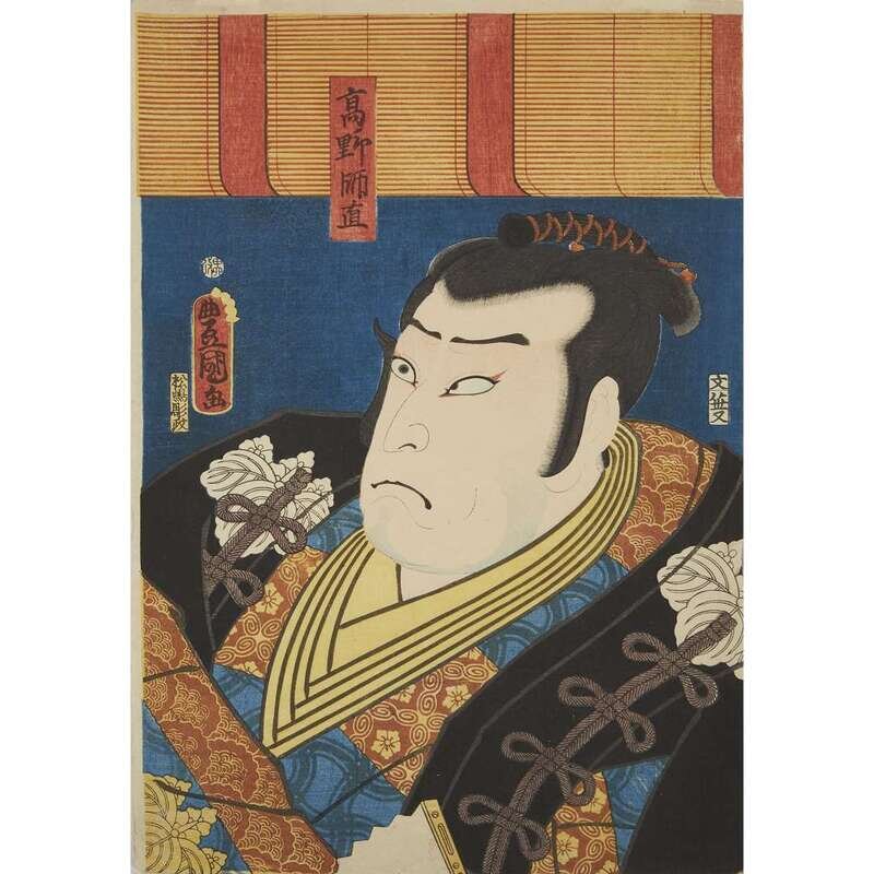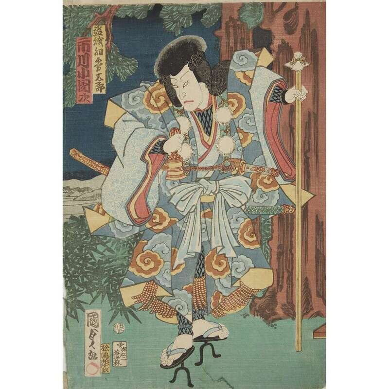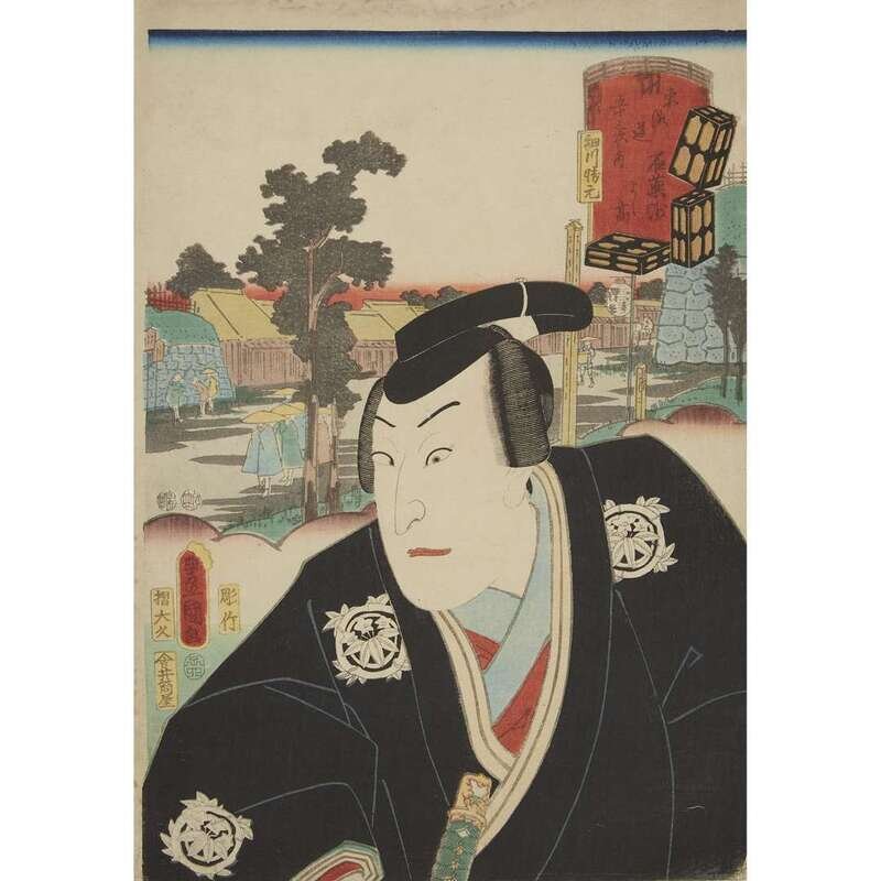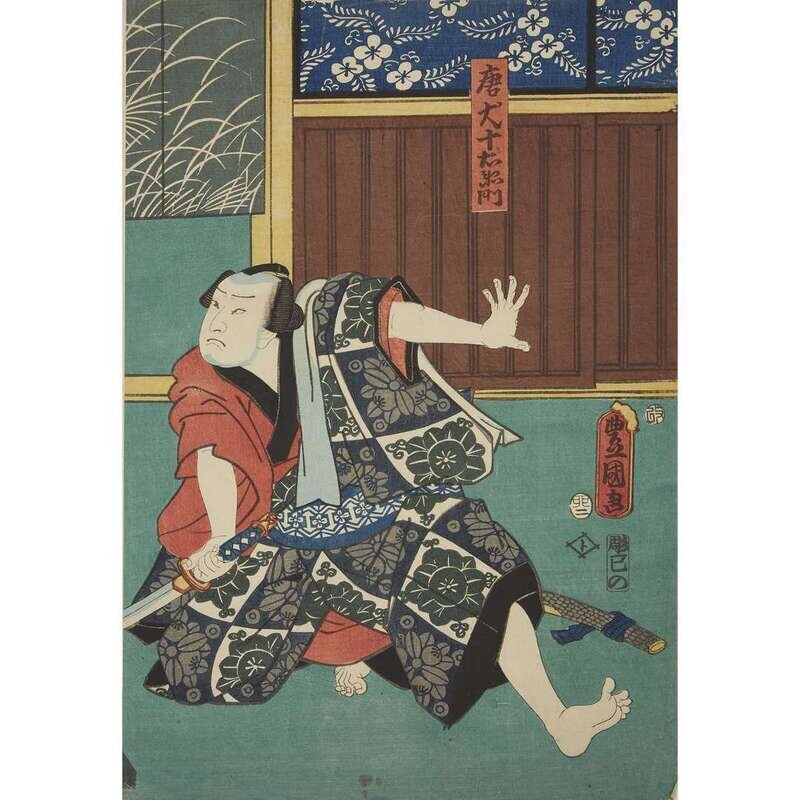 Color woodblock prints, artists including Kunisada and Toyokuni, approximate H: 14 1/4 in., 36.1cm; W: 9 3/4 in., 24.7cm