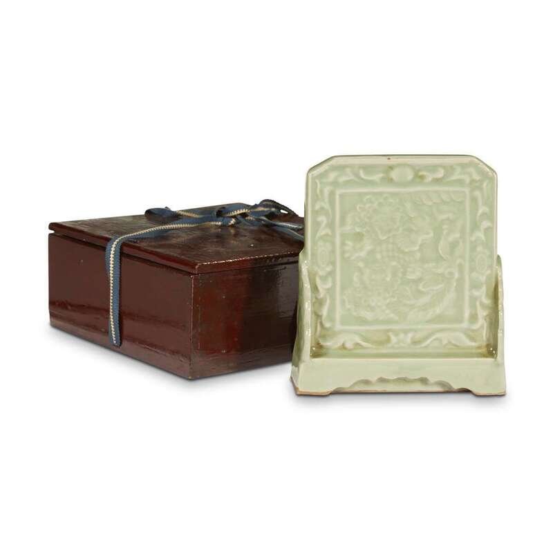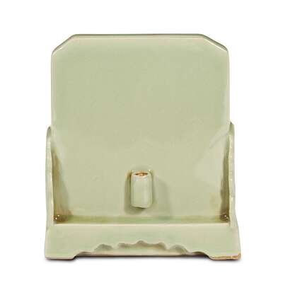 The rectangular screen carved on one side with a dragon , the other side one applied with a taper holder; covered overall with a thick sea-green glaze; with a fitted Japanese lacquered wooden box.