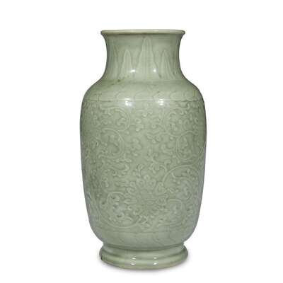 With elongated ovoid body and waisted neck, moulded and incised with stylized lotus scrolls around body and a band of lappets below rim; all covered in a glaze of rich olive-green color.