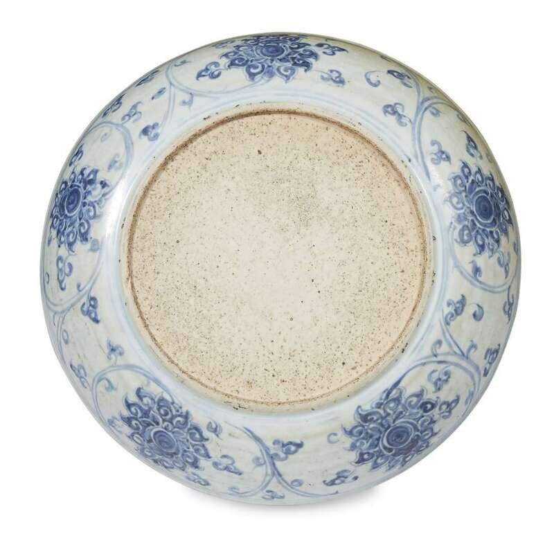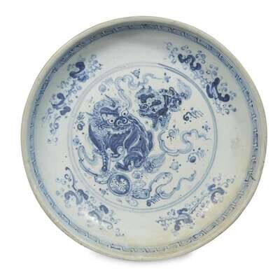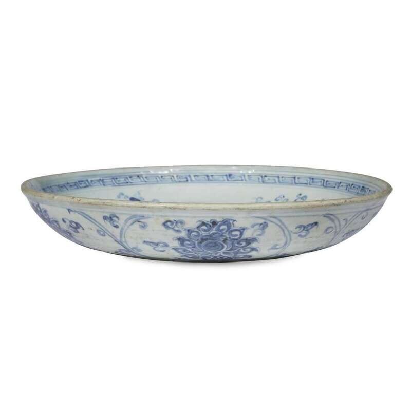 The shallow dish decorated with two lions chasing an embroidered ball within line borders surrounded by four floral sprays and a band of leiwen below rim to interior; the exterior with stylized lotus flowers in roundels.