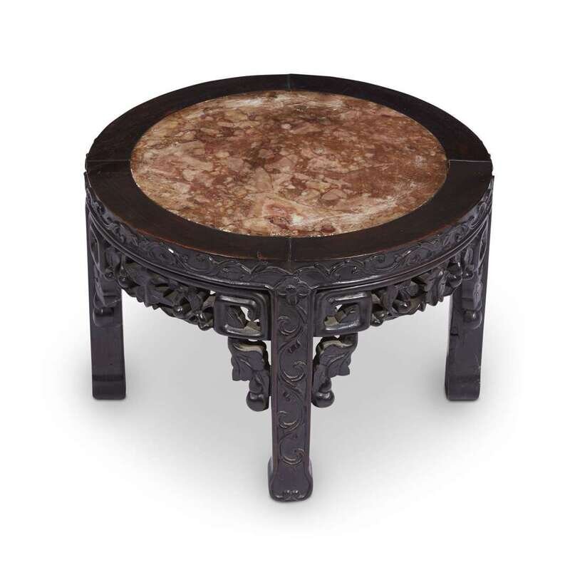 Possibly Guangdong, modeled with dragon and peony roundels above a wave border at the foot, the shoulder with the eight Daoist Immortal's symbols, the ground of mottled blueish-green; sold together with a late 19th century Chinese carved hardwood and mottled beige marble stand.