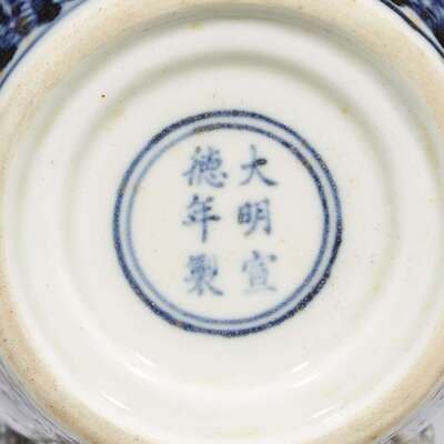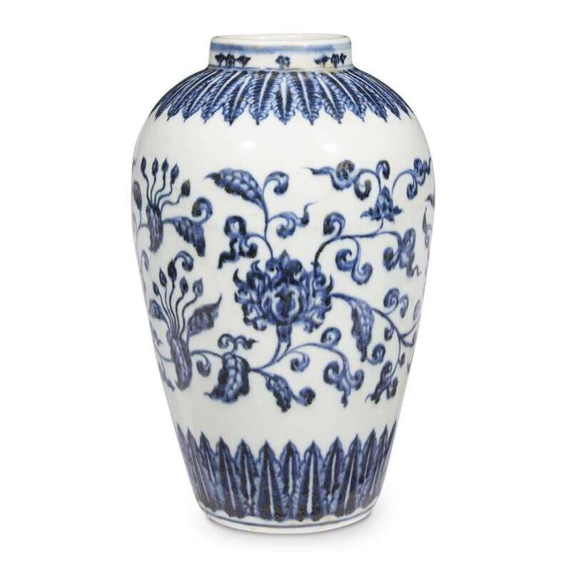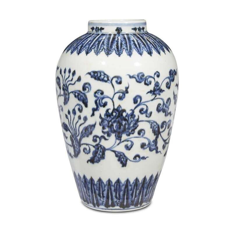 Of ovoid form, decorated with stylized lotus flowers with undulating stems issuing curled leaves, set in-between bands of lappets around shoulder and above foot. LITERATURE: For a related vase, see "Catalogue of the Special Exhibition of Selected Hsuan-te Imperial Porcelains of the Ming Dynasty", National Palace Museum, Taipei, pp 86-87. See also the meiping , offered at Christie's Swire, Hong Kong, September 29, 1992, lot 474.