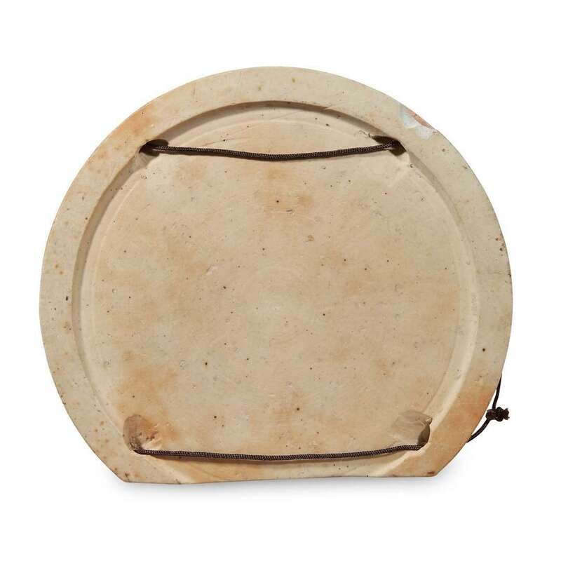 The arched plaque decorated with an official followed by two attendants in landscape with trees and a glimpse of a city wall, "classic" scroll border, the reverse pierced four times.