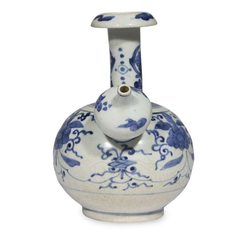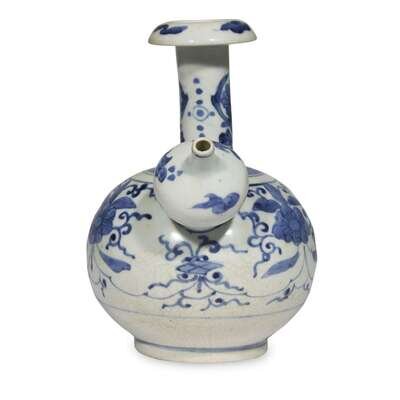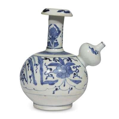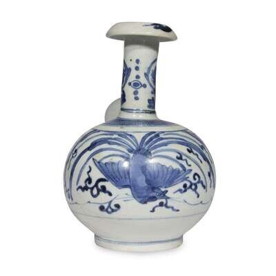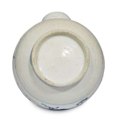 With a bulbous body rising to a slender neck that supports an everted mouth; decorated with a broad band of floral and bird motif, flowers around neck.
