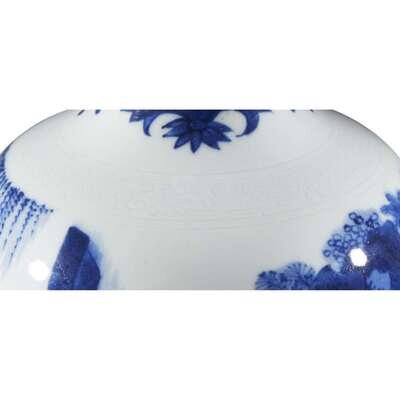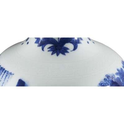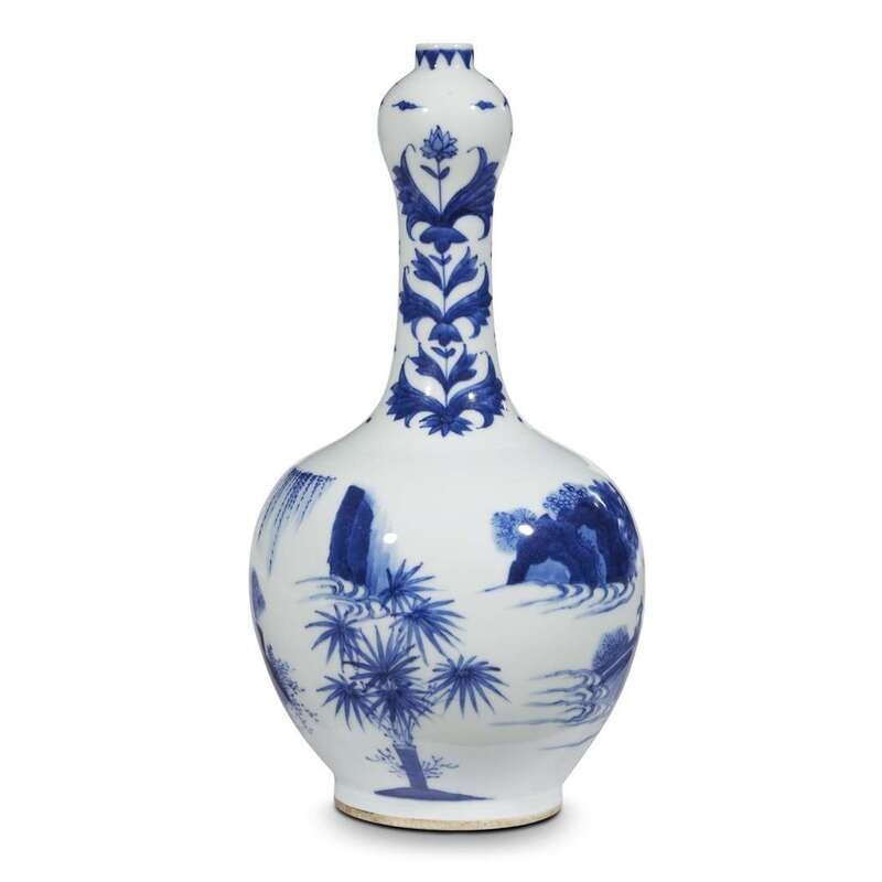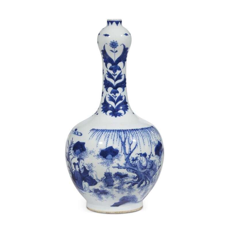 The lower globular section decorated with a group of three scholars at leisure, the neck with stylized flowers.