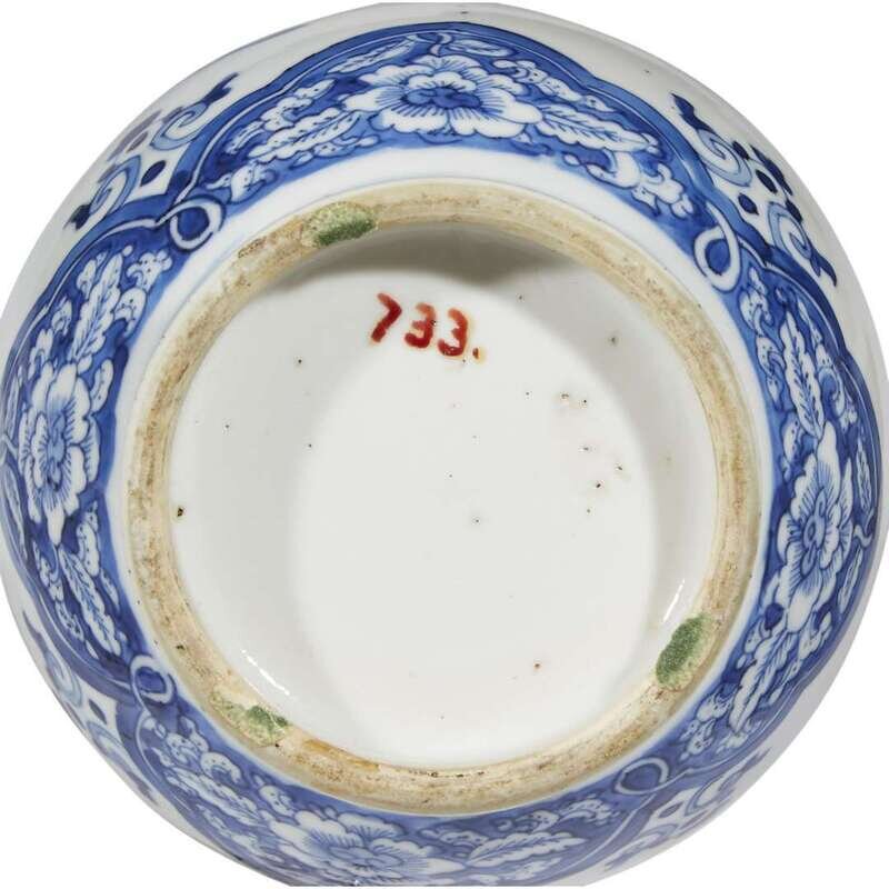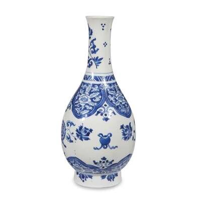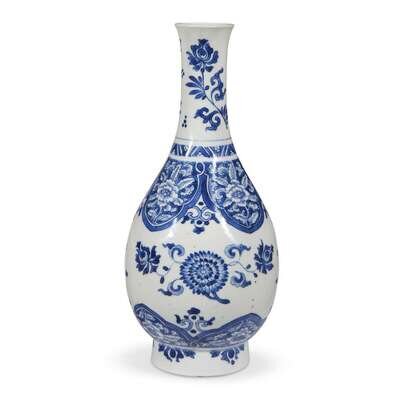 Of round bulbous shape, long thin bottle neck and gently flaring rim, decorated with various floral patterns, with decorative borders to lower neck, shoulder, and above base.