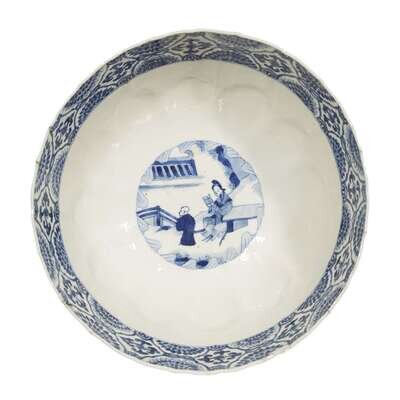 Decorated with reserves of ladies in a garden, and flowers, elaborate chrysanthemum and scroll border to interior.