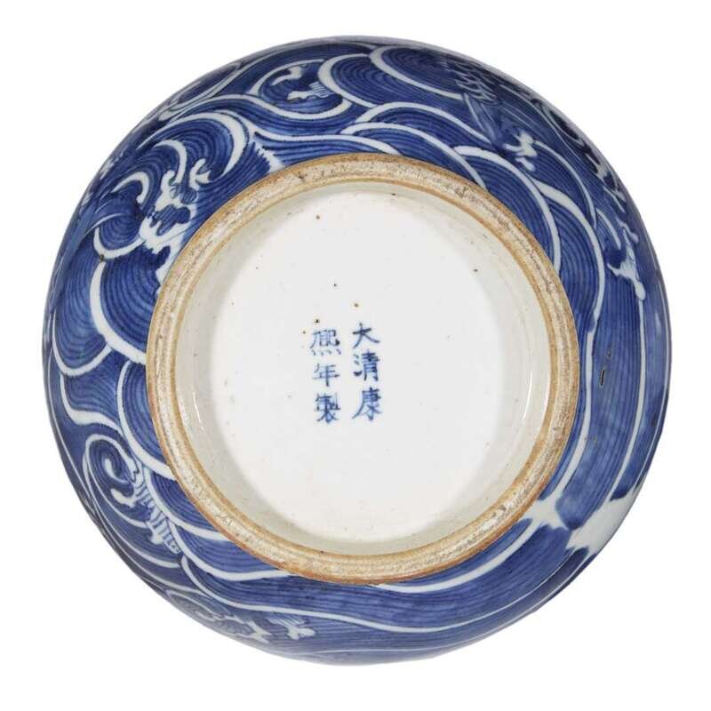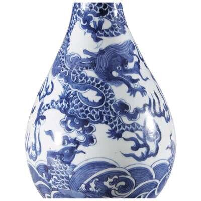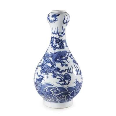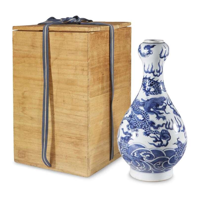 With a pear-shaped body rising to a slender neck and "garlic bulb" shaped mouth, the vase decorated with a four-clawed dragon admist clouds above the sea with carp jumping out; underside with a six-character kangxi mark; with Japanese wooden box.