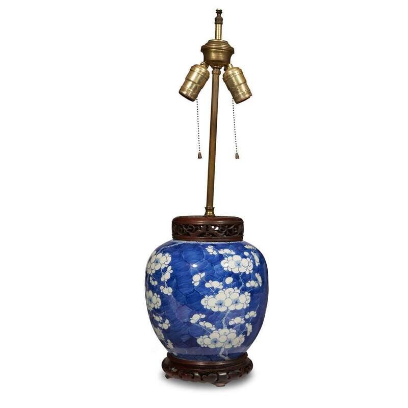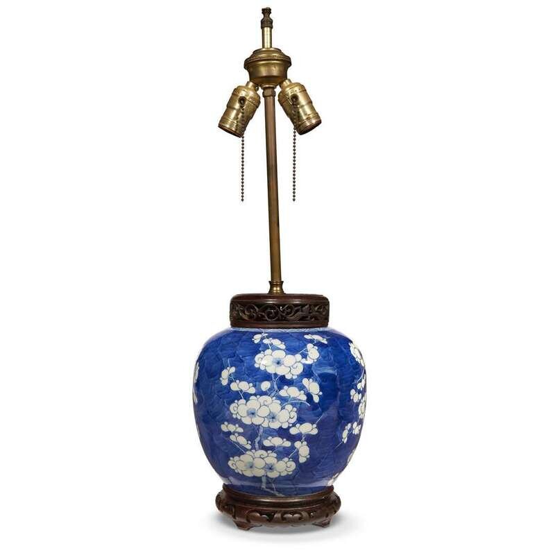A Chinese blue and white porcelain "Prunus" ovoid jar, mounted as a lamp