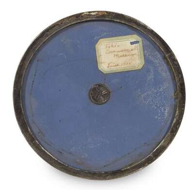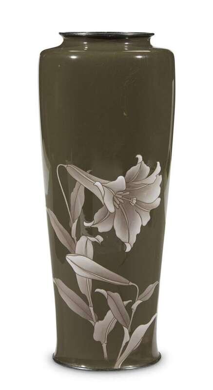 Of tapered cylindrical form with a waisted neck, with silver-mounted rim and foot, decorated with a raised branch of pale-purple day lilies on a dark olive-grey ground; mark of Ando workshop to the underside, bearing an old label inscribed "Tokio Commercial Museum June 1908".