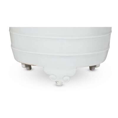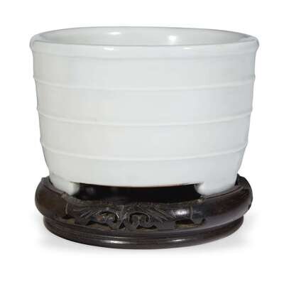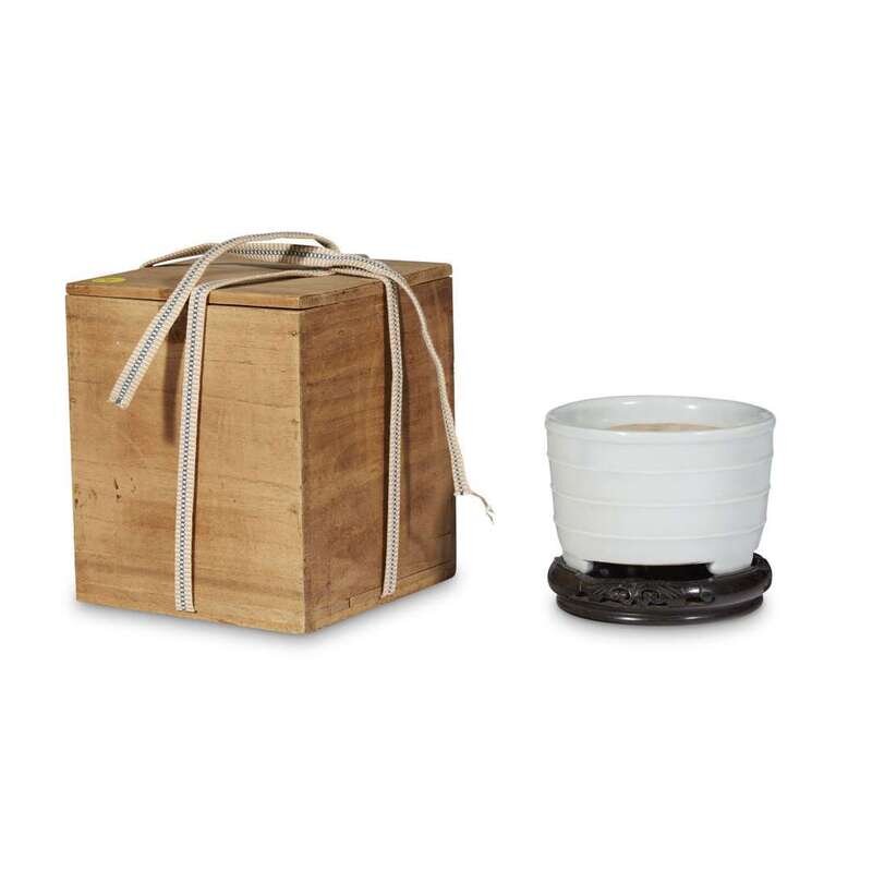 The cylindrical body is raised on three ruyi-form feet and incised with three lines around body; covered overall in an even, ivory-white glaze, with a carved hardwood base and a fitted Japanese box.