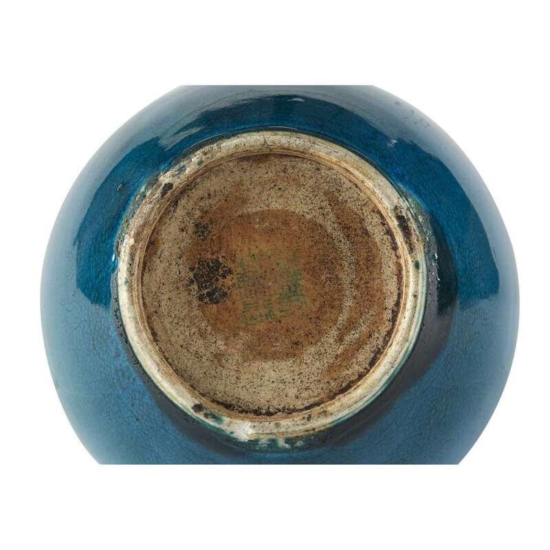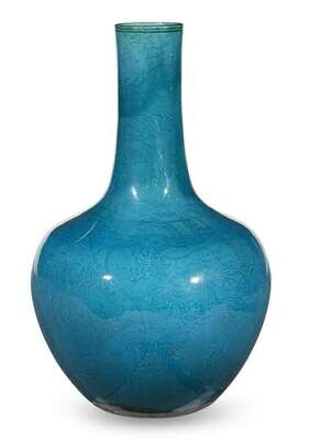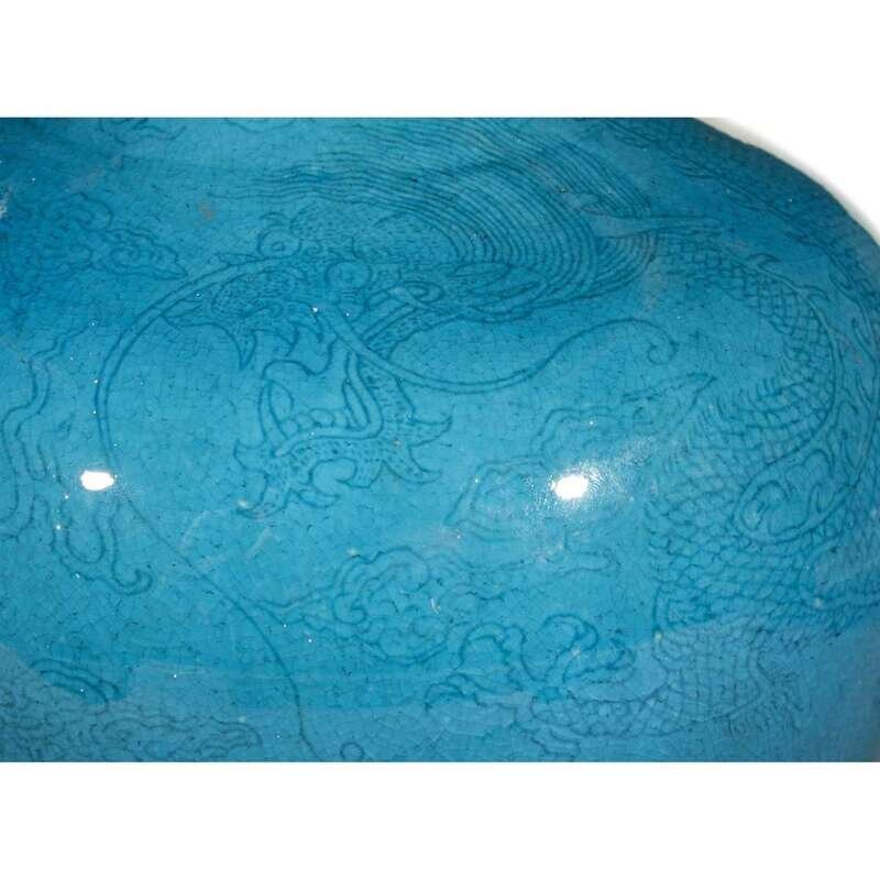 Of globular form with vertical neck, the vase incised with two sinuous five-clawed dragons chasing a flaming pearl amidst cloud scrolls, rich turquoise glaze, pooling at the foot, the unglazed base with incised mark, highlighted with turquoise.