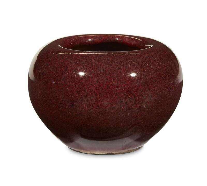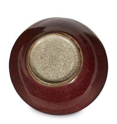 With a rich red-burgundy finely mottled glaze, the underside a finely crackled greyish tone.