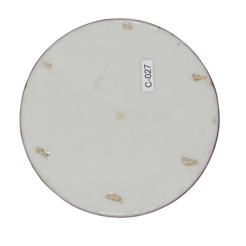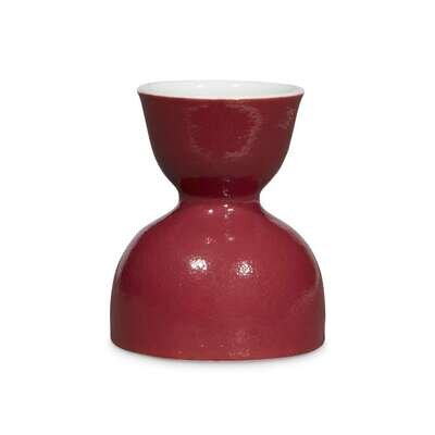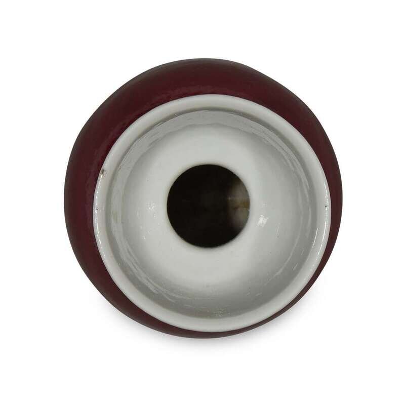 With a wide domed base and deep cup-formed mouth, the exterior glazed with a rich raspberry-red tone, "orange-peel" texture, the underside with seven "sesame-seed" spur marks.