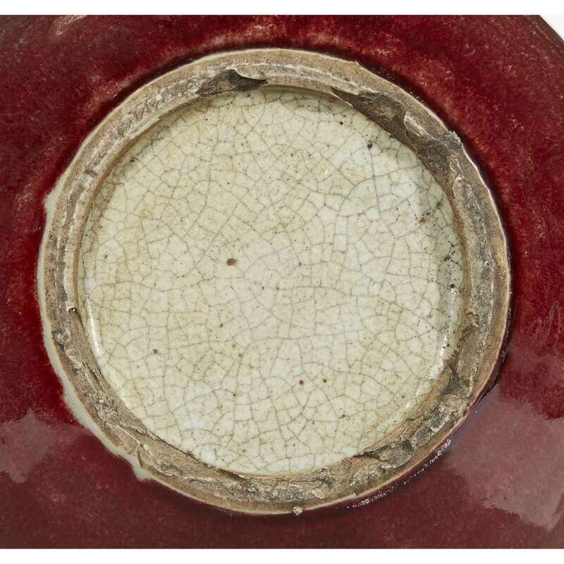 With a finely-mottled glaze, draining from a white-beige at the lip, the color reminiscent of crushed dark raspberries with paler tones above the foot.