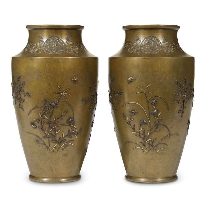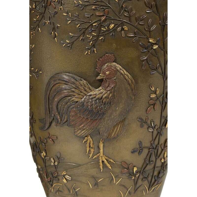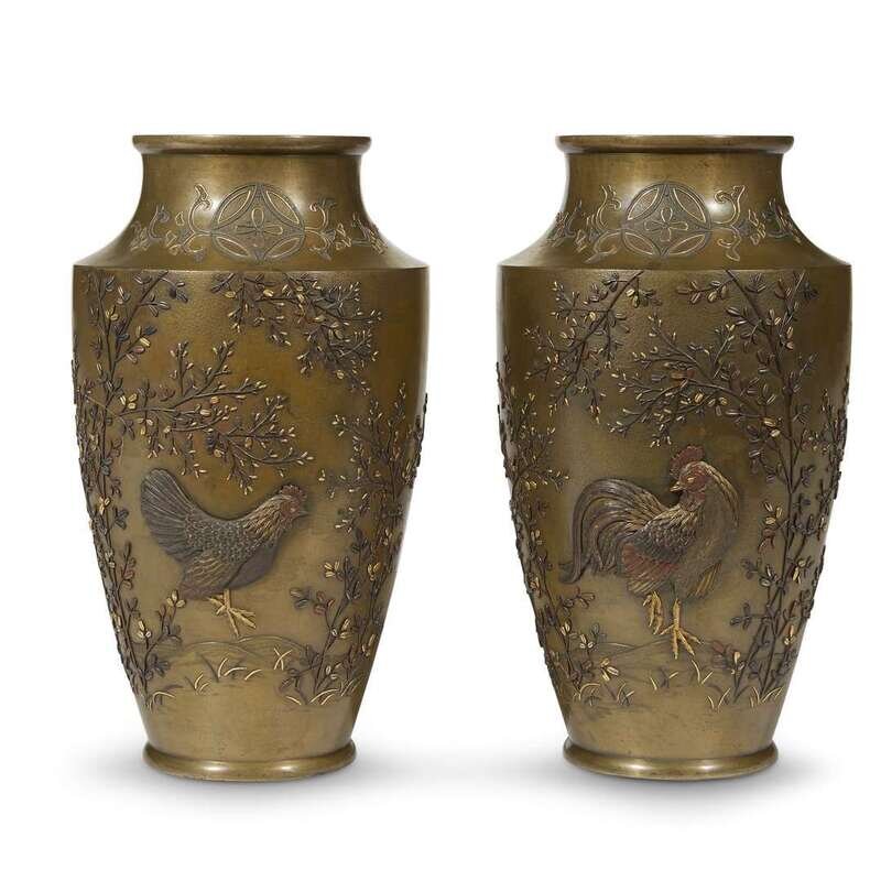 A pair of Japanese patinated bronze and mixed metal-inlaid vases with rooster and hen decoration