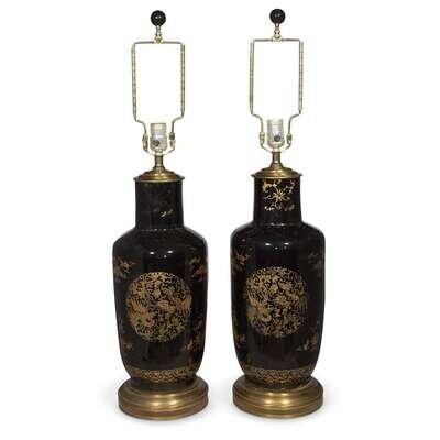A pair of Chinese gilt-decorated "mirror-black"-glazed roleau vases, now mounted as lamps