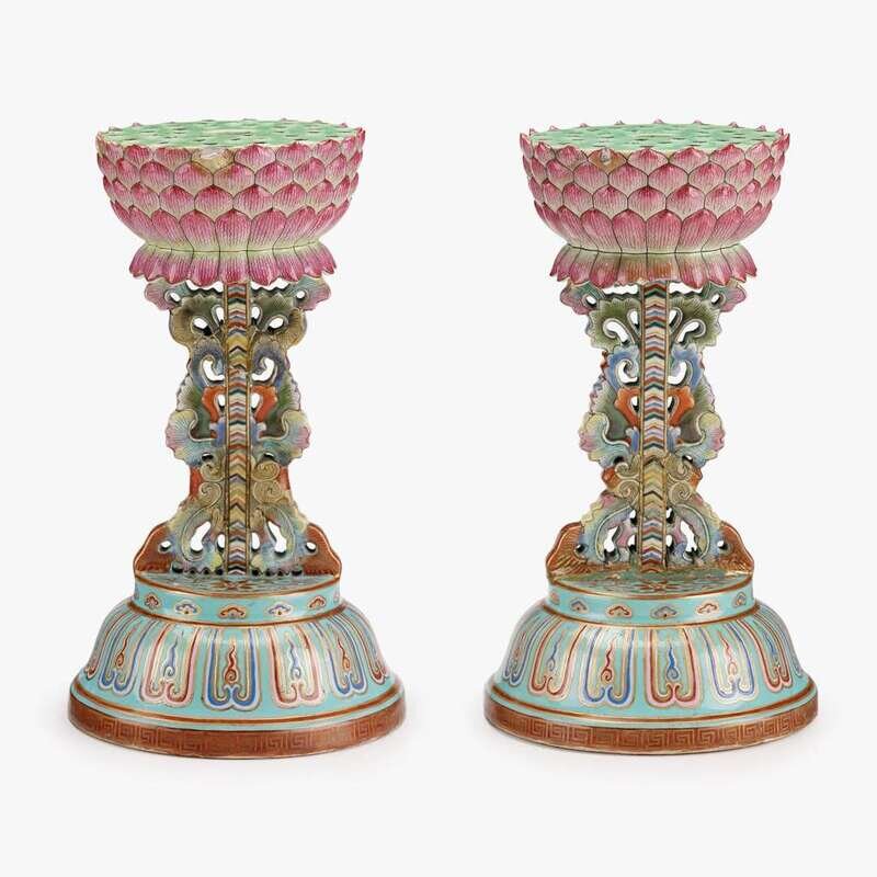 A pair of Chinese famille rose enameled porcelain Buddhist emblem altar stands qianlong mark and of the period