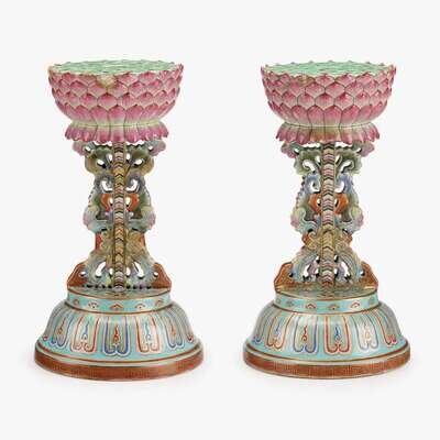 Finely and colorfully enameled and gilt, in the form of lotus blossoms atop an openwork scrolled foliate standard, domed base.