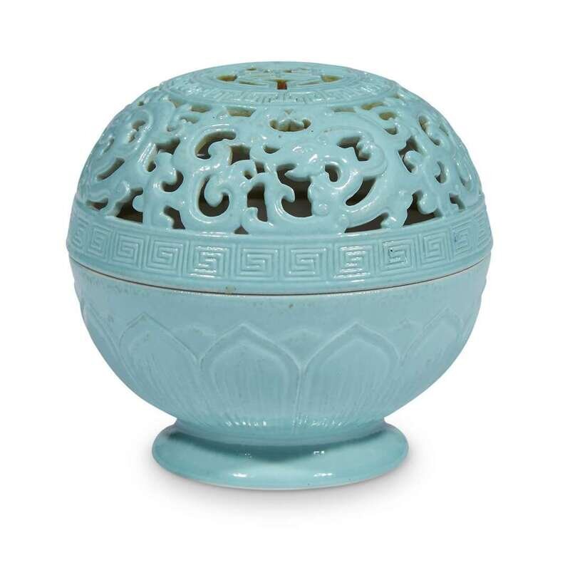 A Chinese turquoise-glazed pierced spherical porcelain censer and cover six character qianlong mark, but later