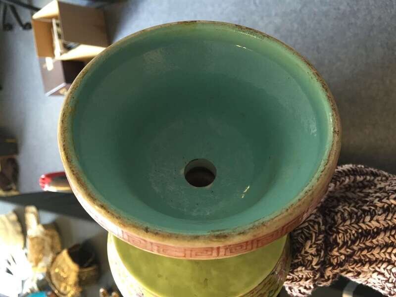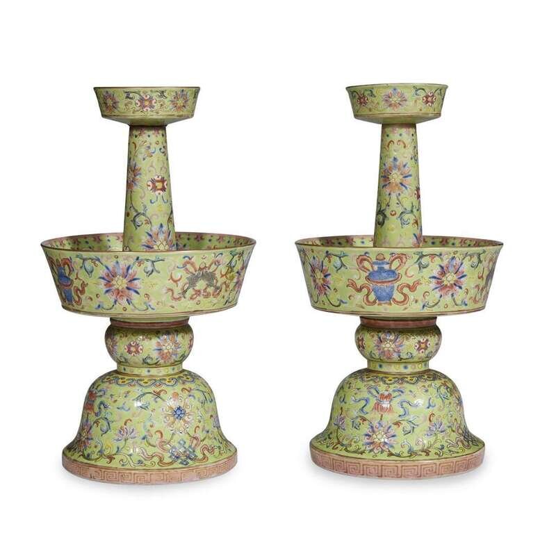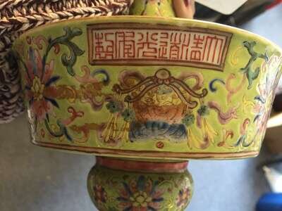Formed in two sections, the lower half of bell and globular form, the upper half formed as a tapering stem with dished circular mouth, enameled with stylized leafy lotus scroll and bajixiang motif, against a yellow ground; with a six-character daoguang mark on side of the dished lip.