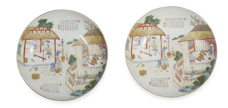 A pair of Chinese famille rose-decorated "Village" dishes depicting farming and weaving daoguang six-character seal mark, and possibly of the period