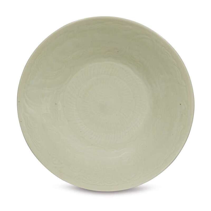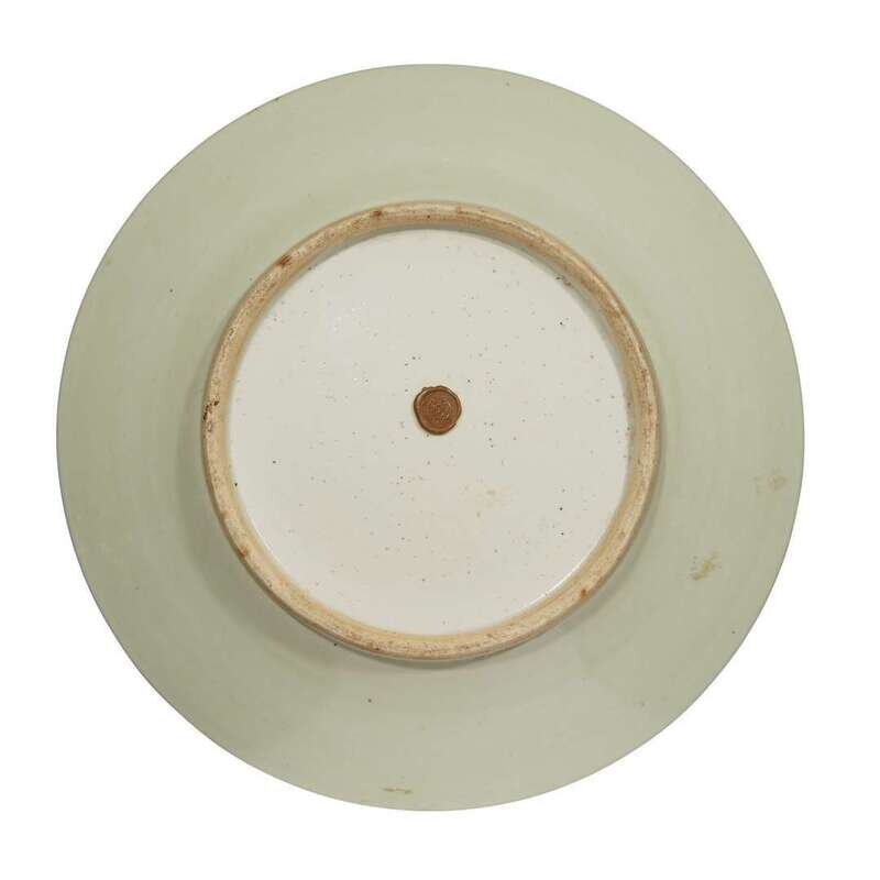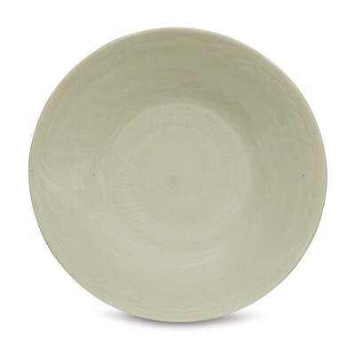 A Chinese celadon-glazed incised porcelain large "Mallow and floral scroll" dish qing dynasty