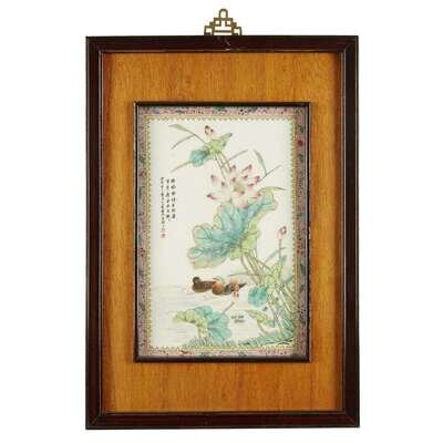 One decorated with magpies among magnolia and prunus, the other with mandarin ducks among lotus, both inscribed and dated, with two seals, framed.
