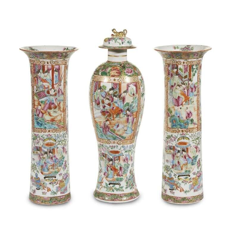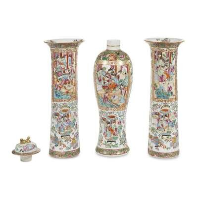 A Chinese Export Porcelain "Rose Mandarin" three-piece vase garniture circa 1850-1880