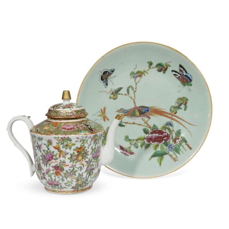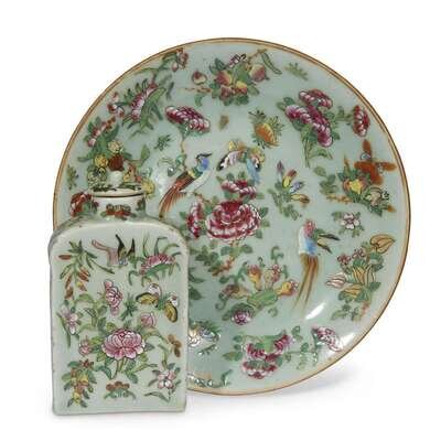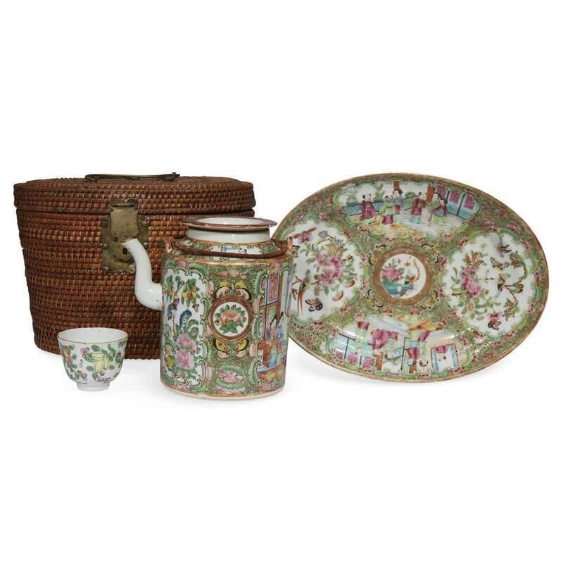 Comprising: two "Rose Medallion" teapots (one with wicker case and cup); an 11 1/2" oval platter; a celadon-ground rectangular tea caddy and associated cover; two celadon ground "Bird, Butterfly and Flower" dishes.