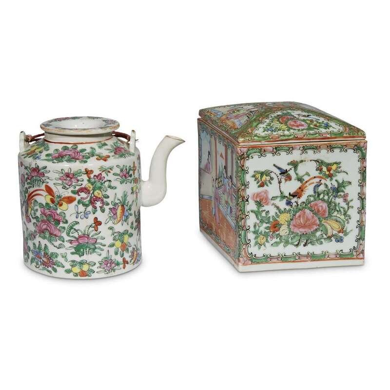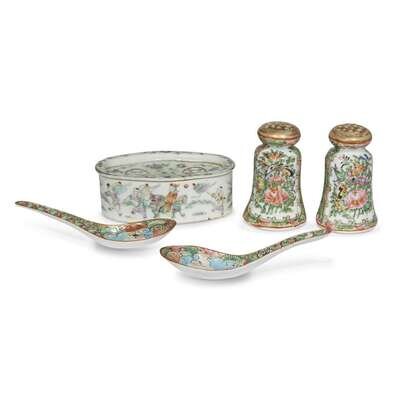Comprising: a cylindrical teapot and cover; a pair of salt and pepper shakers; a lobed oval tray; a rectangular tray with canted corners; two spoons; an oval cricket box(?) and cover, and a large square box and cover, underside stamped MADE IN CHINA.