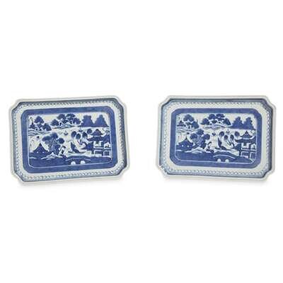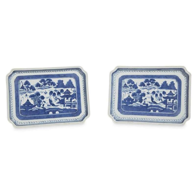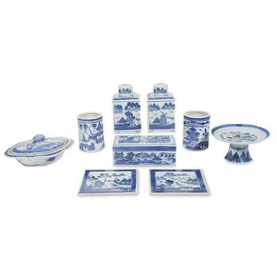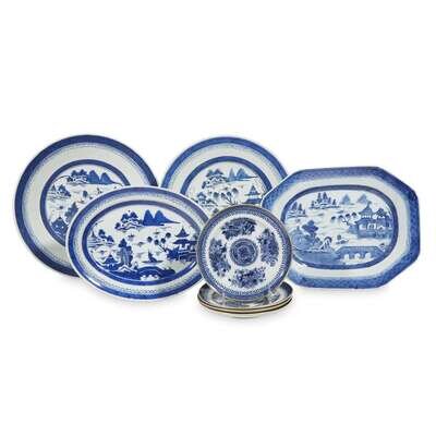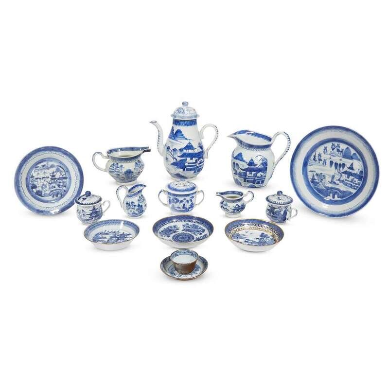 Primarily in the "Canton" pattern, Comprising: an associated pair of 14 1/2" circular chargers; a 14" octagonal tray; four "Fitzhugh" luncheon plates; a 13" oval platter; two 9 3/4" rectangular trays; two assorted plates; a "Fitzhugh" saucer dish; two "Nanking" saucers; an 18th century "cafe au lait" tea bowl and saucer with blue and white interior; three covered pots de creme; three creamers and sauceboats; a covered coffeepot, a jug, a tazza; a covered vegetable dish; two brush pots; a rectangular covered box; two square tiles (one with paper label, "S. K. Co., No. 1417 Made in China"; two covered square tea caddies.