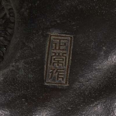 depicting a standing woman with basket and sickle, the base with a seal reading 'Masatsune Saku', rich dark brown patina.