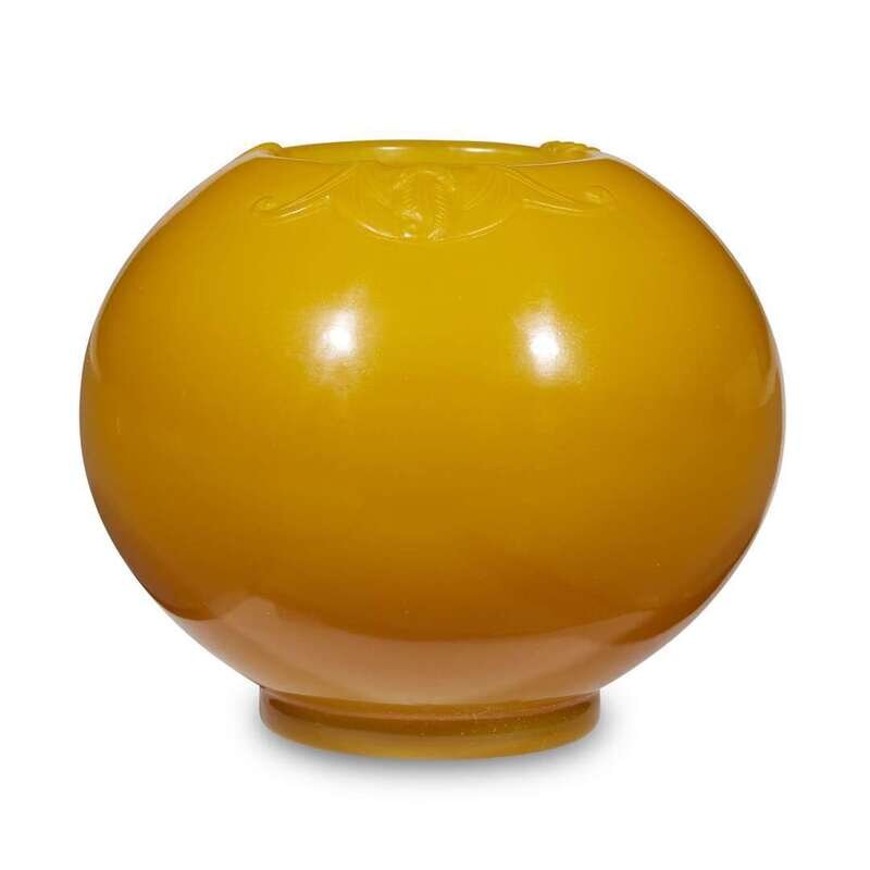 On low circular foot, the shoulder carved in low relief with a clambering qilong and a bat, the glass of rich yellow with a slight opalescent "fire".