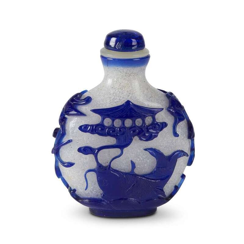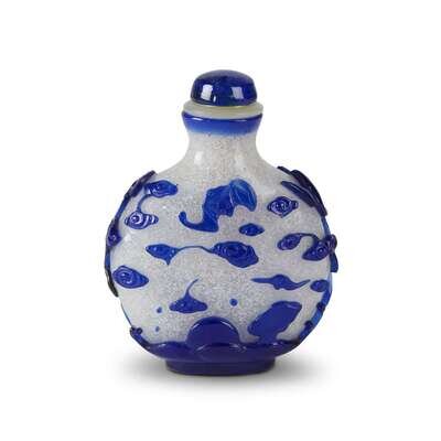 Depicting a carp dreaming of a pavillion, a bat with peaches at one shoulder, crane with reed at other, the reverse with bats above a sun in waves, all against a snowflake ground.