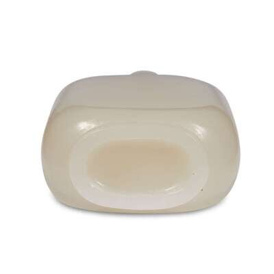 Of an even white tone, the jade is carved in a typical rectangular form.