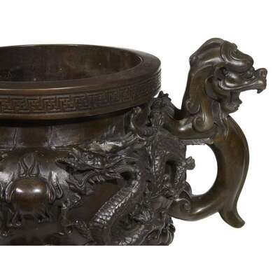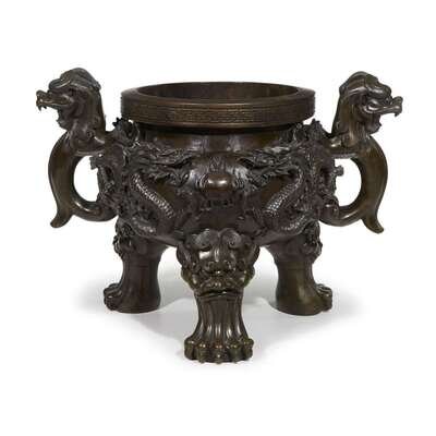 Modeled with dragons, with qilong handles and mask and paw feet, underside with six-character Xuande mark.